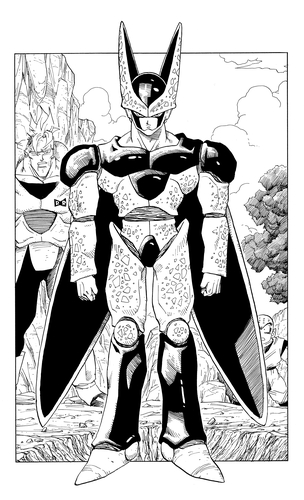 Tras entrenarse en la Room of Spirit and Time para derrotar a los androides, Vegeta supera a Cell en su Second Form con su fuerza. Sin embargo, tras ser desafiado por Cell, cede a su curiosidad sobre la Perfect Form del androide y acepta pausar la batalla por ahora. A pesar de los esfuerzos de Trunks por intervenir, Cell absorbe al Android 18 y evoluciona a su Perfect Form. El panel a página completa a continuación muestra la nueva e imponente forma de Cell.