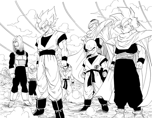 Esta ilustración ocupaba dos páginas enteras y destaca por el contraste entre Goku, sonriendo y pareciendo disfrutar de la situación, y las expresiones nerviosas de Gohan y los demás. Tras un breve interludio con la aparición de Mr. Satan , el combate entre Goku y Cell finalmente comienza.