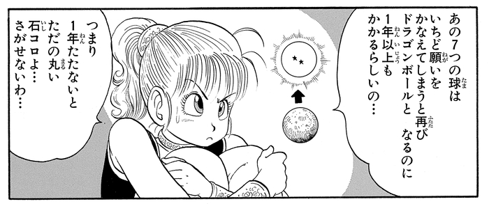 Pilaf invoca a Shenron para pedirle un deseo, pero Oolong lo intercepta. Tras concederle el deseo, las Esferas del Dragón se convierten en piedra y no pueden volver a usarse durante un año, dejando a Bulma desanimada.