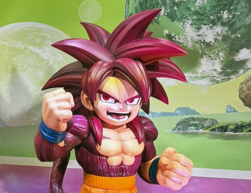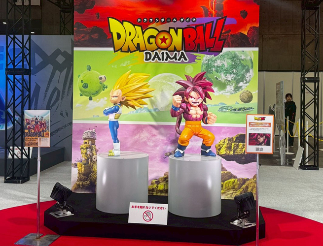 Las estatuas de Goku Super Saiyan 4 (Mini) y Vegeta Super Saiyan 3 (Mini) del anime Dragon Ball DAIMA se exhibieron en el stand de Toei Animation. ¡Ver a Goku posando así para una pelea es suficiente para animar a cualquiera!
