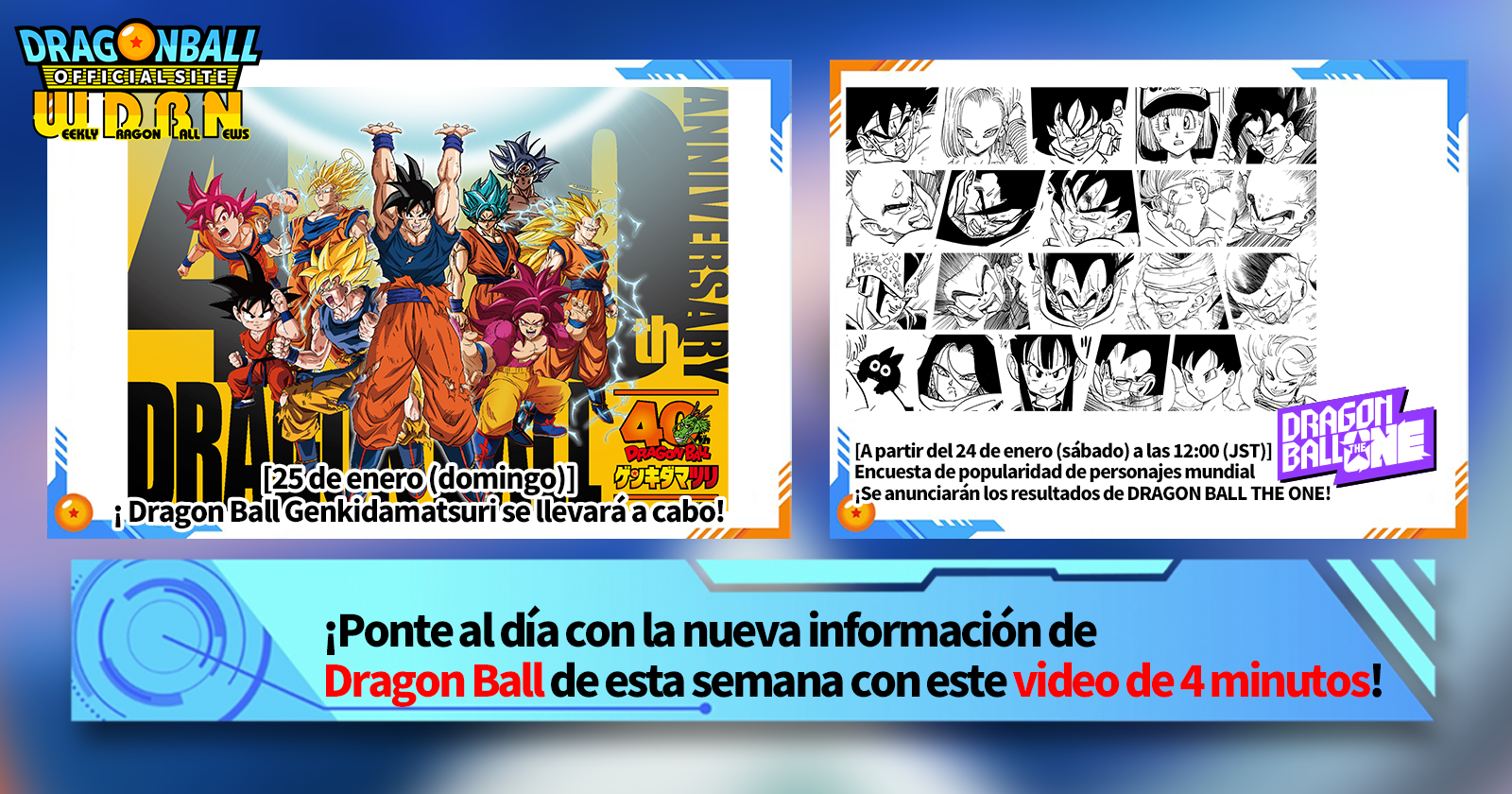 "Noticias semanales de Dragon Ball" es una serie de videos que se actualiza cada lunes (JST) para ofrecerte las últimas noticias del mundo de Dragon Ball. ¡Únete al editor de V Jump , Victory Uchida, quien cubre la información más reciente de la semana anterior, además de novedades como información sobre nuevos productos y noticias del sitio web para la próxima semana!