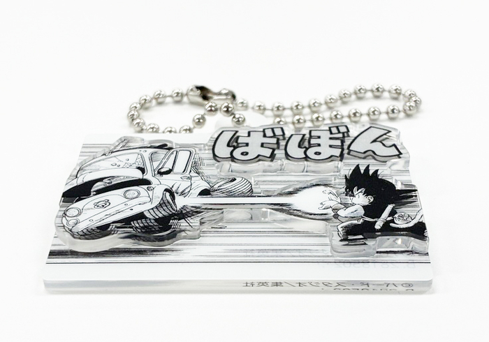 ¡Se utilizaron técnicas de troquelado en cada uno de estos dijes acrílicos de dos capas para hacer que Goku y los efectos de sonido realmente resalten!