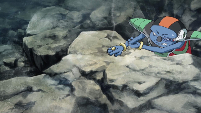 Sorbet observa el duelo entre Frieza y Goku desde detrás de una roca, pero cuando Frieza se ve acorralado, se lanza para disparar un rayo desde el anillo de su dedo, impactando al Saiyan en el lado izquierdo del pecho. Este era el plan de contingencia que Frieza le había ordenado seguir de antemano.