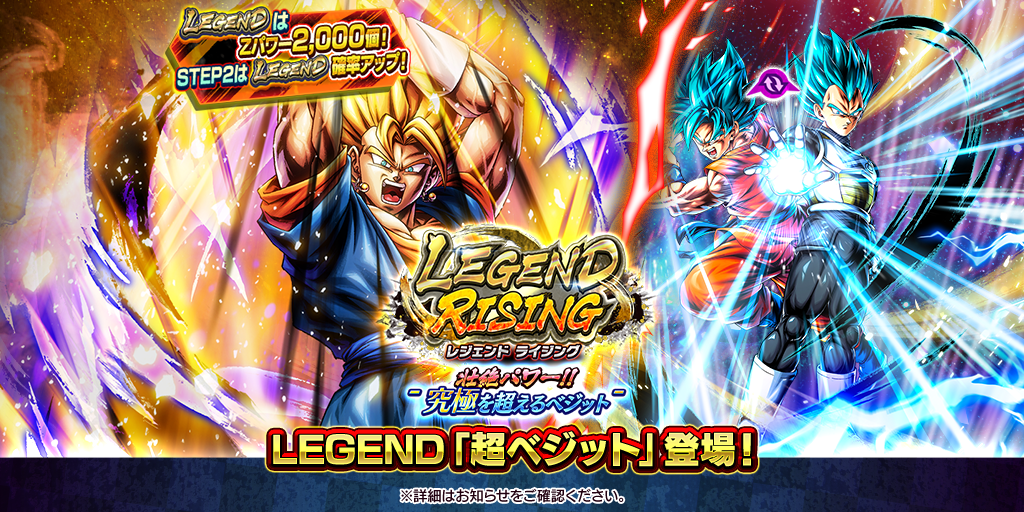 En honor a la incorporación de Super Vegito LEYENDA como el primer personaje de rareza LEYENDA, ¡ya está disponible "LEGEND RISING - ¡PODER SUBLIME! ¡UN VEGITO MÁS ALLÁ DE LO DEFINITIVO!"! Al igual que con los personajes ULTRA, ¡los personajes LEYENDA incluirán 2000 de Poder Z!