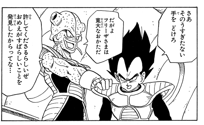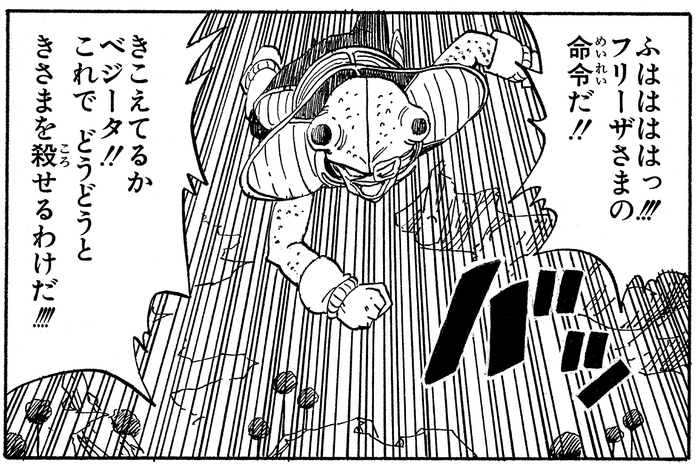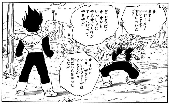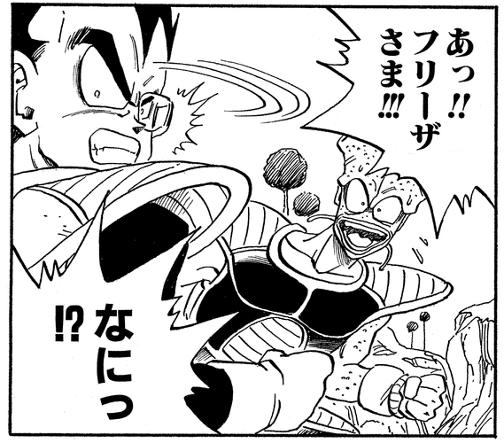 Aterrorizado, Kiwi intenta engañar a Vegeta para que forme equipo con él y derroten juntos a Frieza .