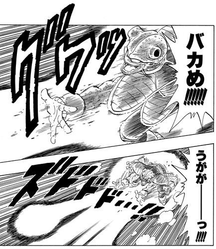Cuando Vegeta se da cuenta del engaño de Kiwi, Kiwi lo toma por sorpresa gritando: "¡Oh! ¡Maestro Frieza!" y disparando una sucesión de feroces ráfagas de energía hacia él.
