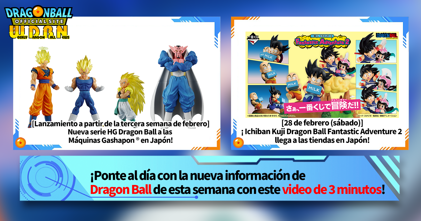 "Noticias semanales de Dragon Ball" es una serie de videos que se actualiza cada lunes (JST) para ofrecerte las últimas noticias del mundo de Dragon Ball. ¡Únete al editor de V Jump , Victory Uchida, quien cubre la información más reciente de la semana anterior, además de novedades como información sobre nuevos productos y noticias del sitio web para la próxima semana!
