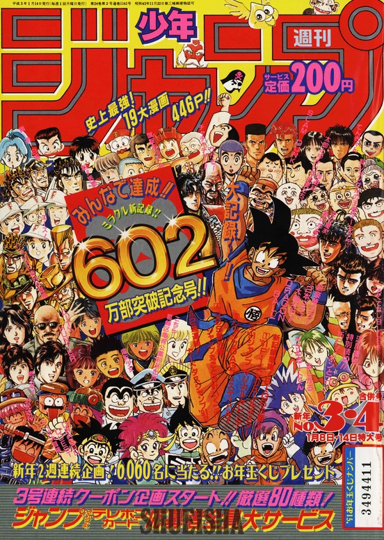 La portada del número que conmemora los más de 6,02 millones de ejemplares de la Weekly Shonen Jump presentó una alineación repleta de estrellas de 19 mangas de éxito. Goku ocupa el centro del escenario, levantando el brazo con energía. Al observar más de cerca, también se puede ver a Gohan, Krillin y Bulma corriendo para unirse a las celebraciones con los atuendos que usaron en el Planet Namek. Este número también marcó el sexto aniversario de Dragon Ball e incluyó una impresionante función doble de la pelea con Frieza.