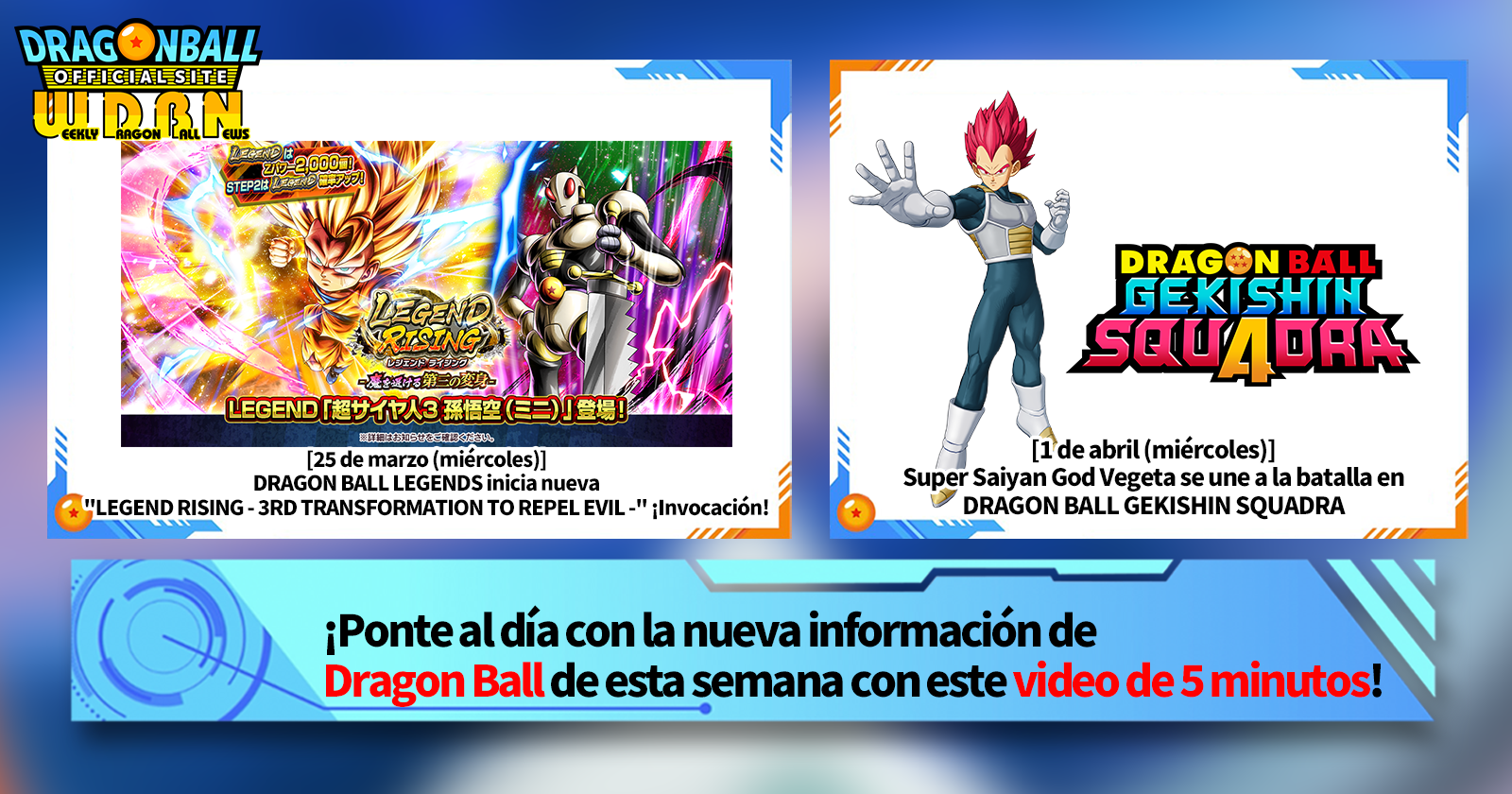 "Noticias semanales de Dragon Ball" es una serie de videos que se actualiza todos los lunes (hora de Japón) para traerte las últimas noticias del mundo de Dragon Ball. Acompaña al editor de V Jump, Victory Uchida, mientras repasa la información más relevante de la semana anterior, así como las últimas novedades, como información sobre nuevos productos y noticias del sitio web para la semana siguiente.