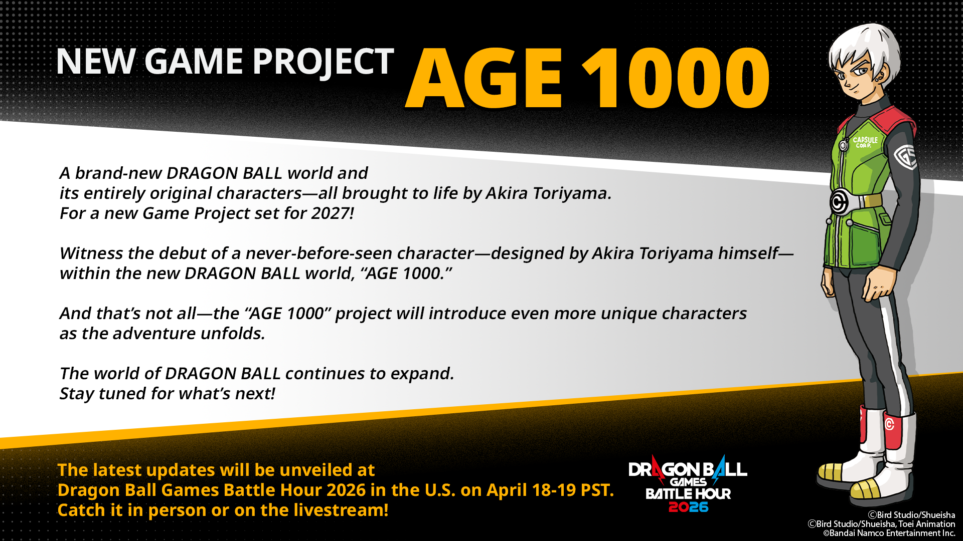¡La información más reciente sobre AGE 1000, un nuevo proyecto de videojuego, se anunciará durante el evento Battle Hour Times! ¡Este evento también incluirá las últimas novedades de los juegos de Dragon Ball y mucho más!