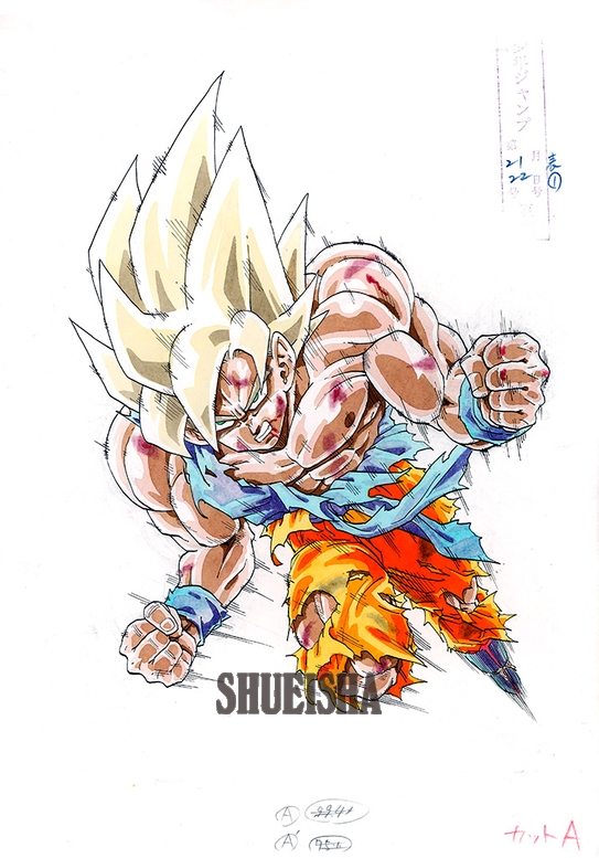 Esta ilustración de Goku Super Saiyan apareció en la portada de la Weekly Shonen Jump en medio de la épica batalla contra Frieza. Al observar este boceto, se puede apreciar claramente la intensa determinación de Goku, la articulación de sus músculos y las líneas de movimiento que muestran no solo velocidad, sino también su inmenso poder.