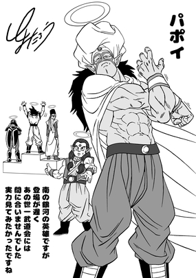 En el manga de Dragon Ball , Kaio South comentó mientras veía a Goku entrenar en preparación para el Tenkaichi Budokai que Papoi podía "comerse a este tipo para el desayuno".