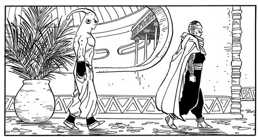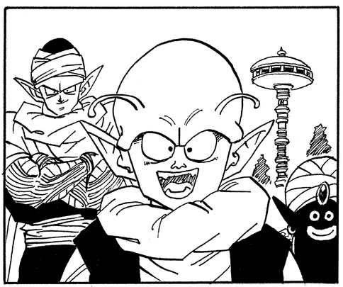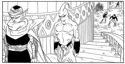 ¡La escena clásica en la que Piccolo escolta lentamente a Majin Buu por el palacio con la esperanza de ganar más tiempo para completar el entrenamiento de Goten & Trunks nos brinda muchas ilustraciones preciosas con las que trabajar! Piccolo parece que conoce el diseño laberíntico del palacio como la palma de su mano mientras conduce a Majin Buu por un pasillo sinuoso tras otro.