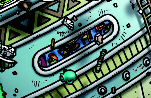 ¡Entonces, veamos qué podemos encontrar en esas escaleras! Esta pequeña área se parece a la que acabamos de ver, ¡excepto que no hay paredes! Después del choque de Goku con Majin Buu, parece que sus sesiones de entrenamiento con Goten y Trunks trasladaron aquí.