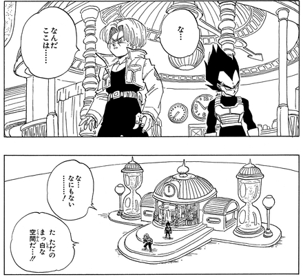 ¡Bien, mira eso! ¡Puedes ver sillas y mesas a través de la ventana! Es una habitación de aspecto extrañamente normal en comparación con el resto del palacio. Sin embargo, hay un par de macetas colocadas inexplicablemente al lado de la mesa, lo que le da a la habitación una sensación más de otro mundo. De todas las habitaciones que existen dentro del Kami's Palace, la única que ha sido completamente ilustrada es la Sala del Espíritu y el Tiempo, lo cual es una lástima porque nos morimos de ganas de saber cómo Dende y los demás han decorado sus propios espacios de vida.