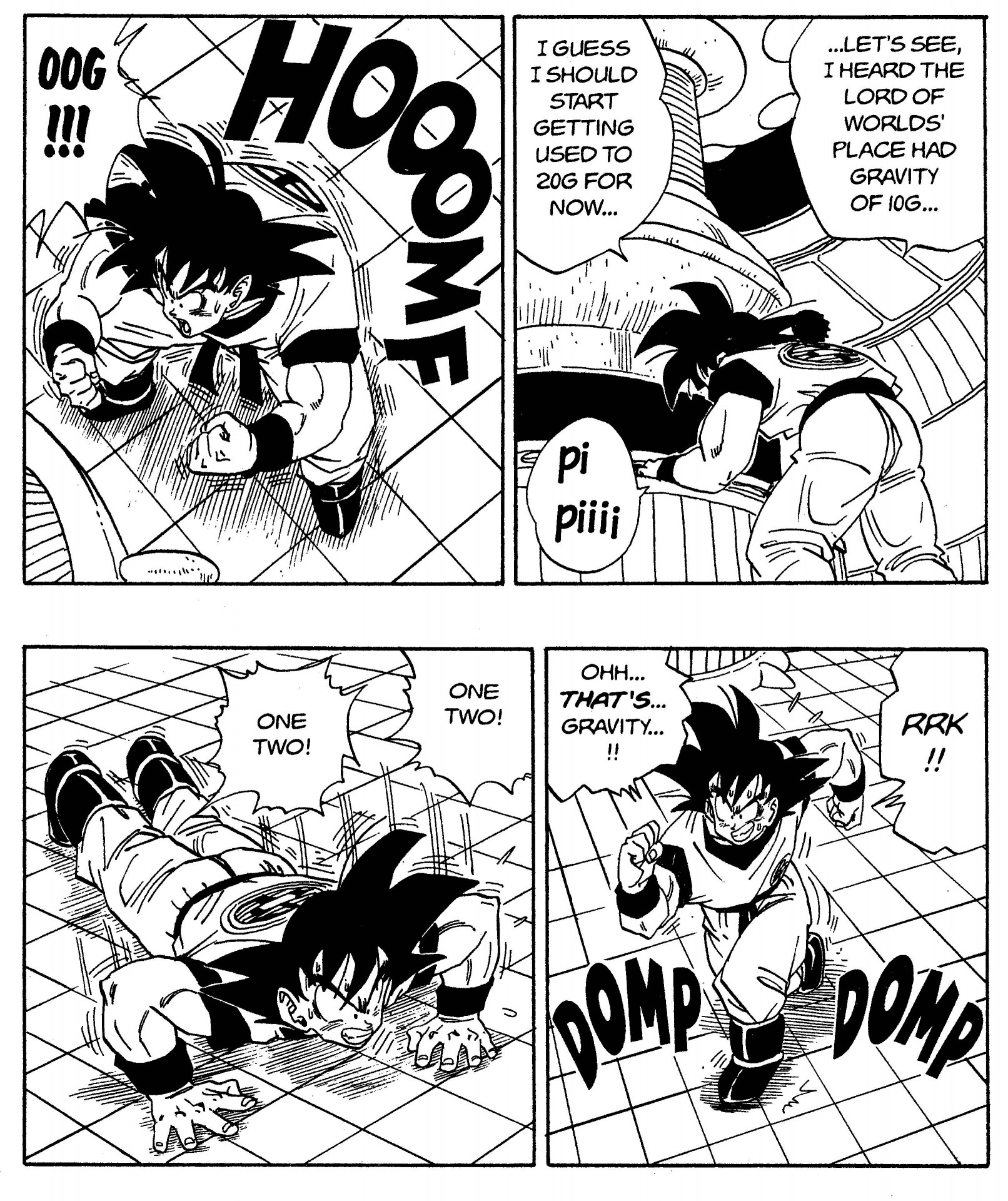 Goku realiza diligentemente su entrenamiento de gravedad en la nave espacial que se dirige al Planet Namek.