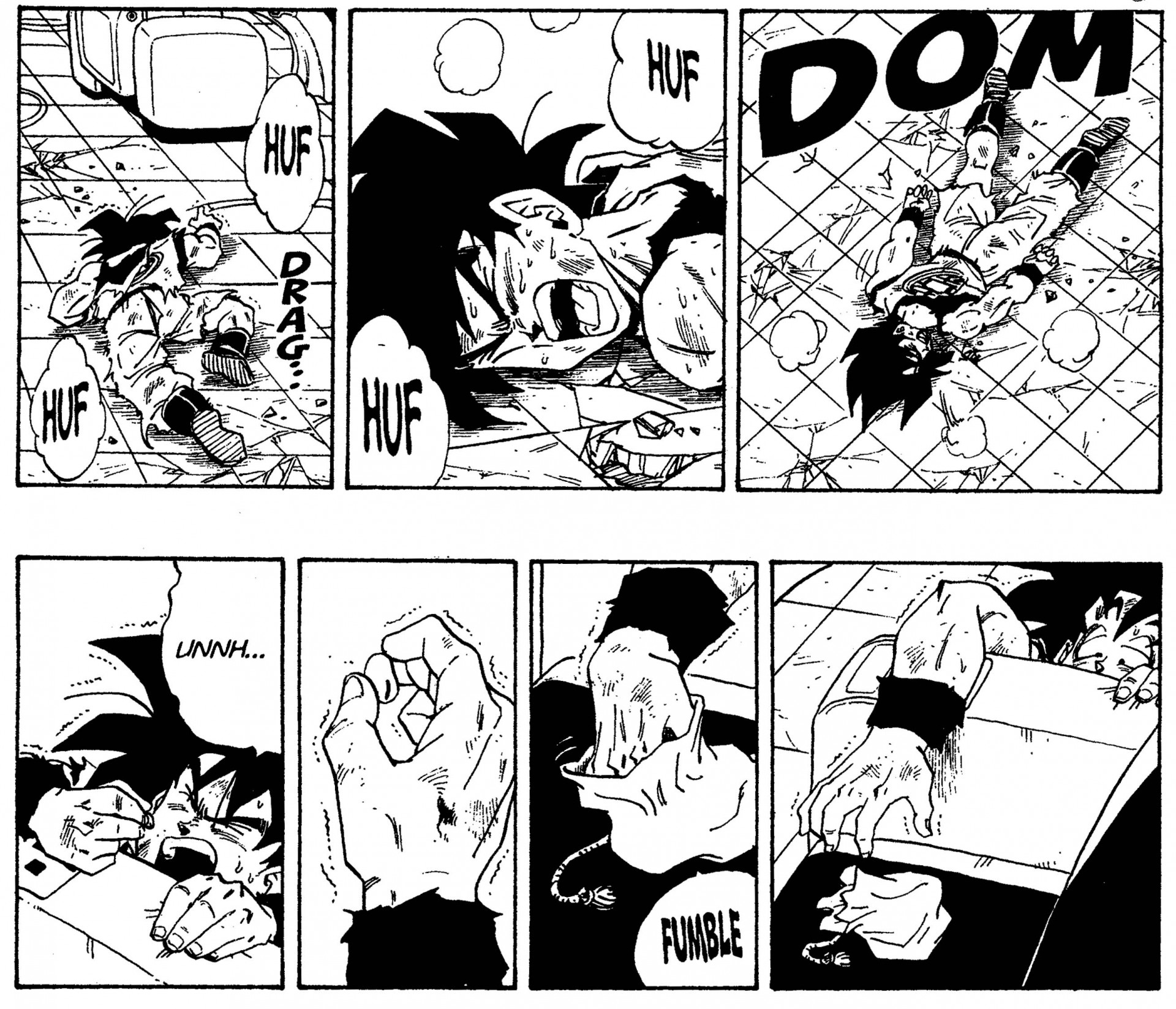 Goku gateando sobre su vientre, alcanzando un frijol Senzu.