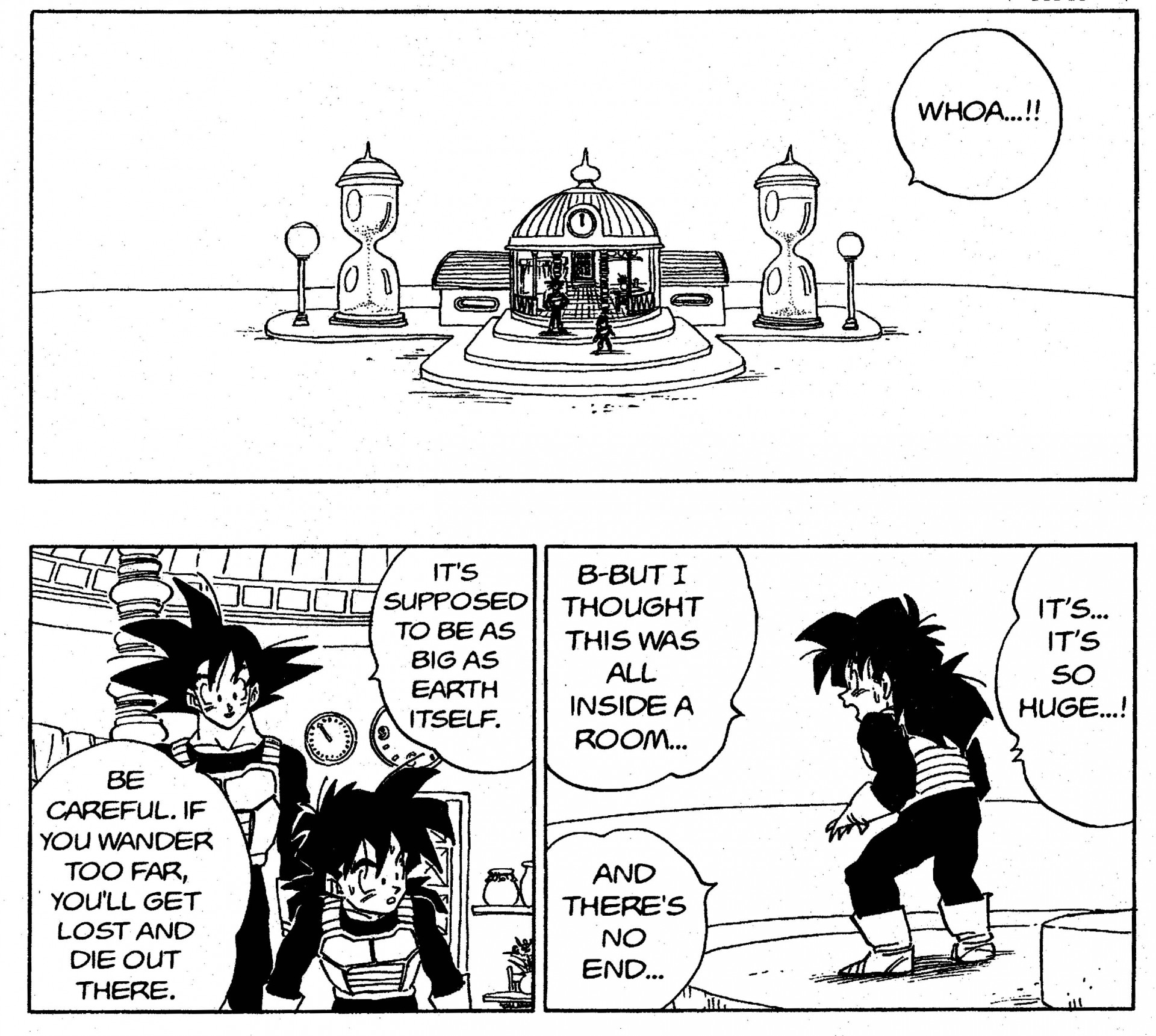 Interesante. Ahora que lo mencionas, la Room of Spirit and Time es completamente blanca, incluido el cielo. No se menciona explícitamente en el manga, pero ¿podrías decir que este entorno completamente blanco y súper brillante ayudó al entrenamiento de Goku y Vegeta al aumentar su tasa de adquisición de habilidades motoras?