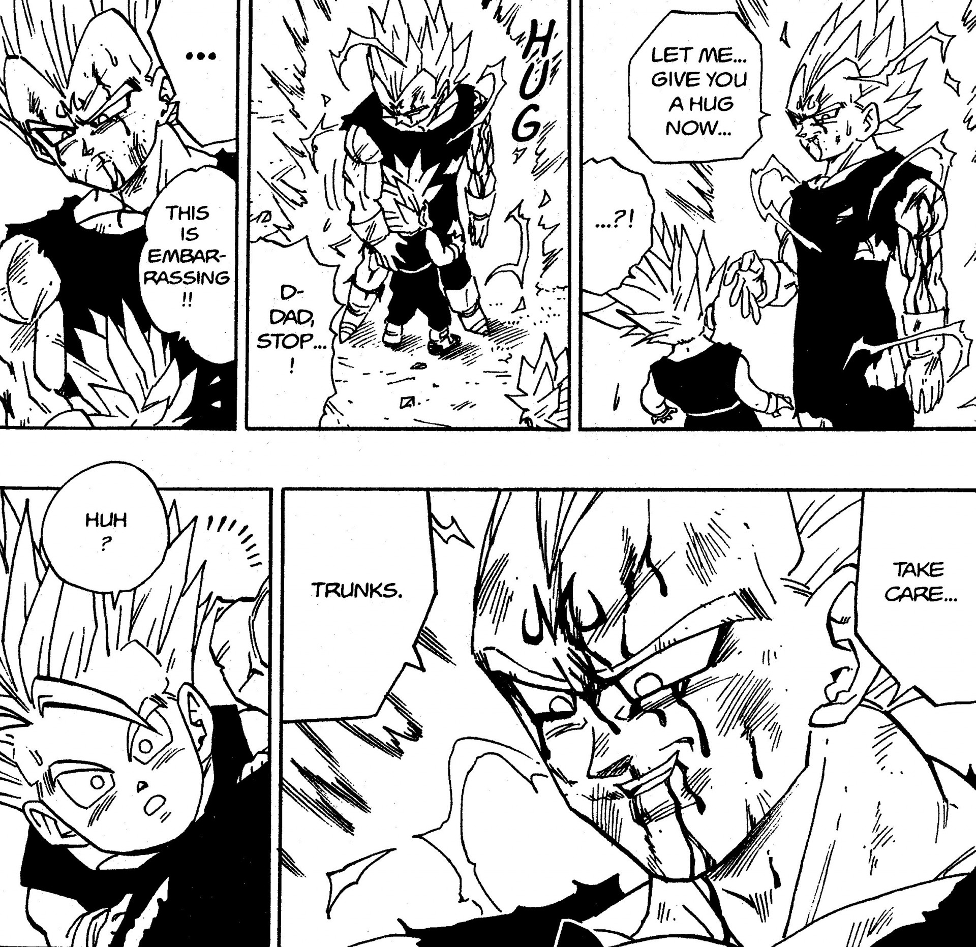 Una última escena que nos gustaría destacar es la conmovedora despedida entre el dúo padre-hijo de Vegeta y Trunks. En los momentos antes de partir para enfrentarse a Majin Buu, Vegeta, sabiendo muy bien que esta batalla le cobrará la vida, abraza a su amado hijo por primera vez. Con Trunks algo perdido, la calidez de la expresión de Vegeta cuando le dice a su hijo, "Cuídate ... Trunks", ¡seguro que nos pone la piel de gallina!