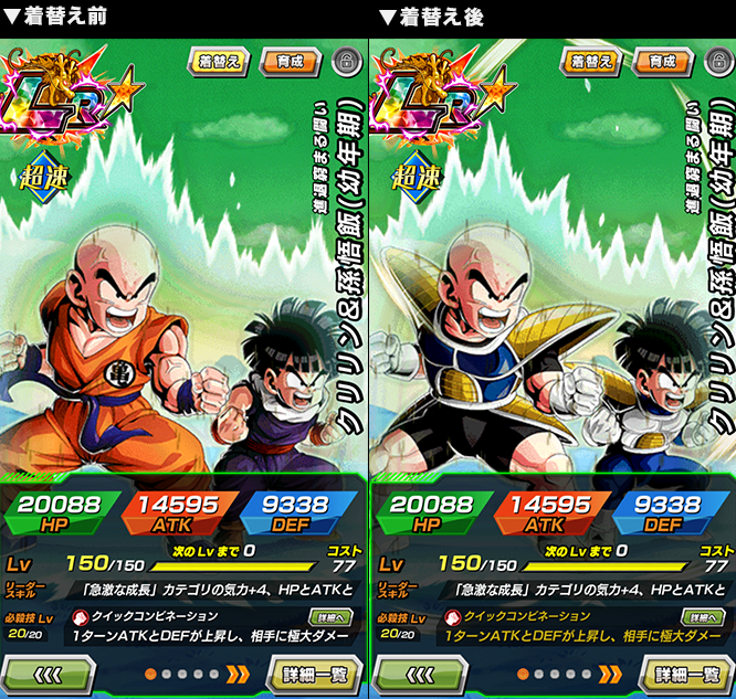 * La habilidad pasiva de LR [Dilema en el campo de batalla] Krillin y Gohan (niño) cambia después de haber usado su Cambio de atuendo. Su habilidad activa se puede activar independientemente del cambio de atuendo.