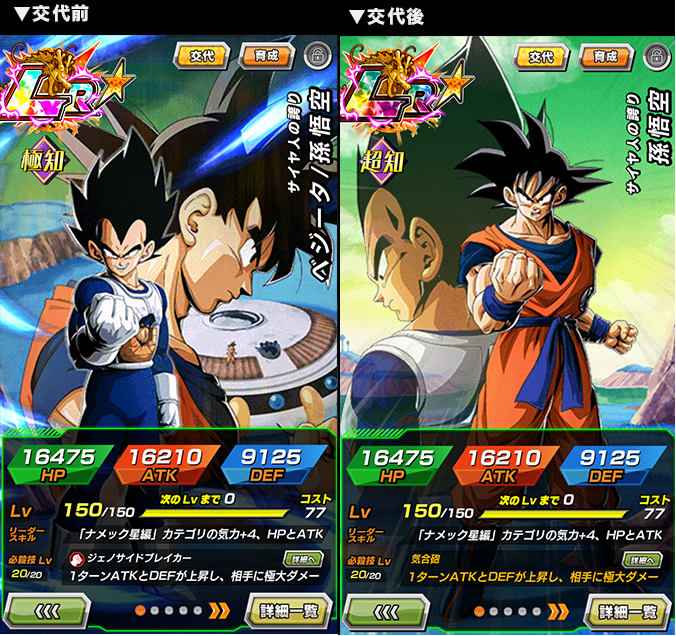 ¡La habilidad pasiva de LR [Saiyan Pride] Vegeta/ Goku les permite revivir como Goku si son KO en ciertas condiciones en la batalla! Una vez que Goku ha sido lanzado a la refriega, tendrá una alta probabilidad de anotar golpes críticos si hay un enemigo de la categoría "Planet Namek Saga". ¡Sé testigo del poder desatado de estos dos guerreros Saiyan!