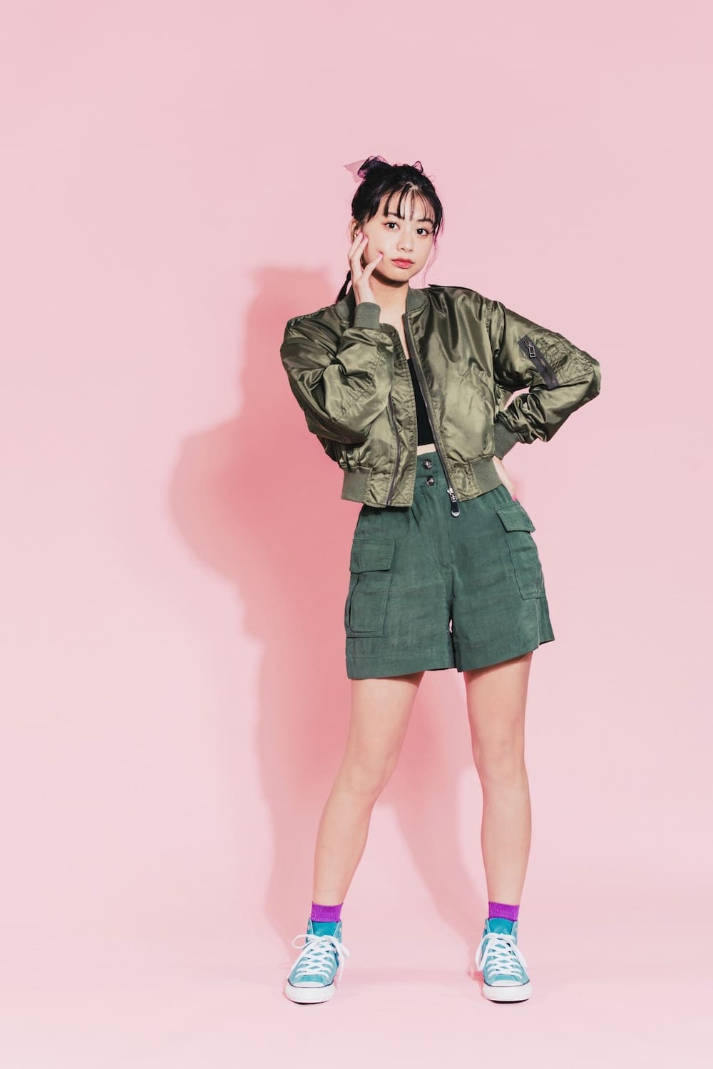 Chaqueta de bombardero: SLY/ Top: CANAL JEAN / Pantalones cortos: H&M
