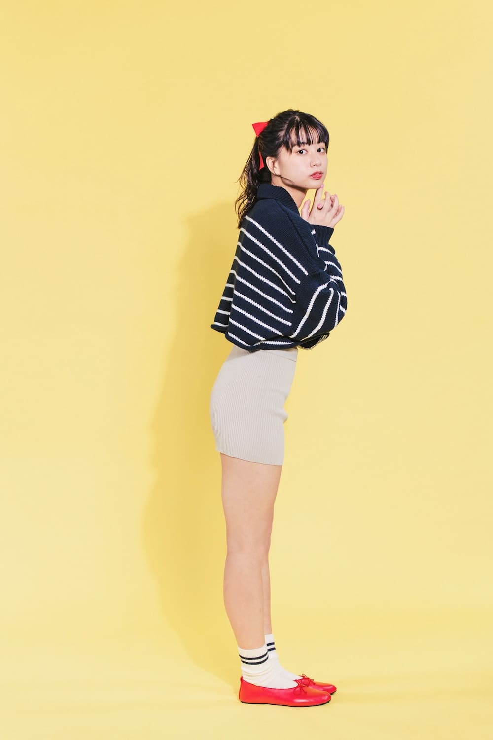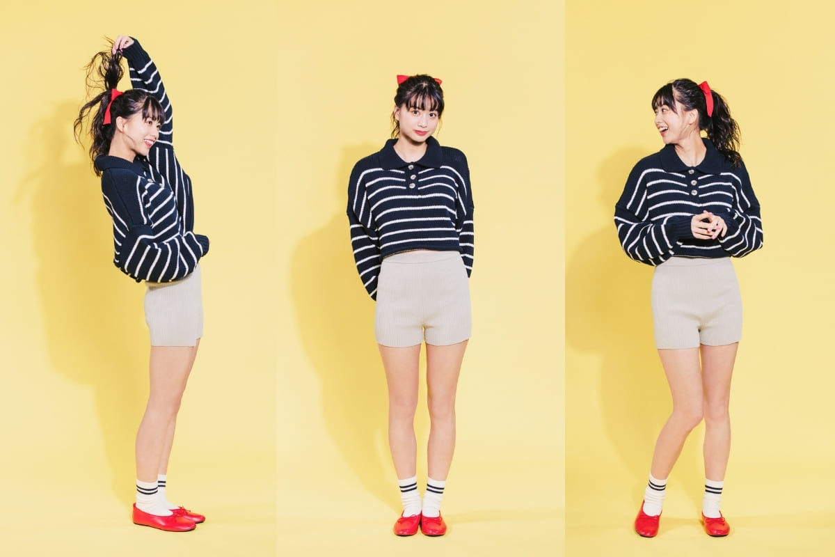 Dado que la parte superior y los pantalones cortos son relativamente simples, la cinta roja y los zapatos realmente resaltan, con los calcetines levantados que le dan al conjunto femenino un toque de marimacho bienvenido.