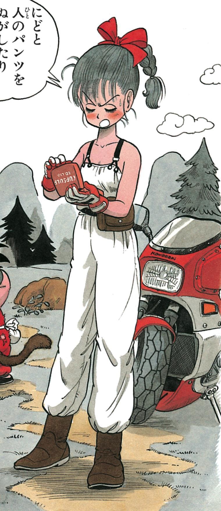 Entonces, ¿quizás las sudaderas con capucha y las chaquetas que aparecen en la primera mitad del manga son en realidad todas de Yamcha? * risas * Supongo que Bulma se embarcó en una gran aventura por sí misma, así que no es de extrañar que también pueda lucir un poco rebelde. Es casi como si incluir artículos de hombre en sus atuendos en realidad termina acentuando su naturaleza adorable.
