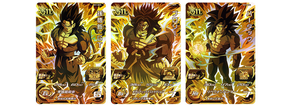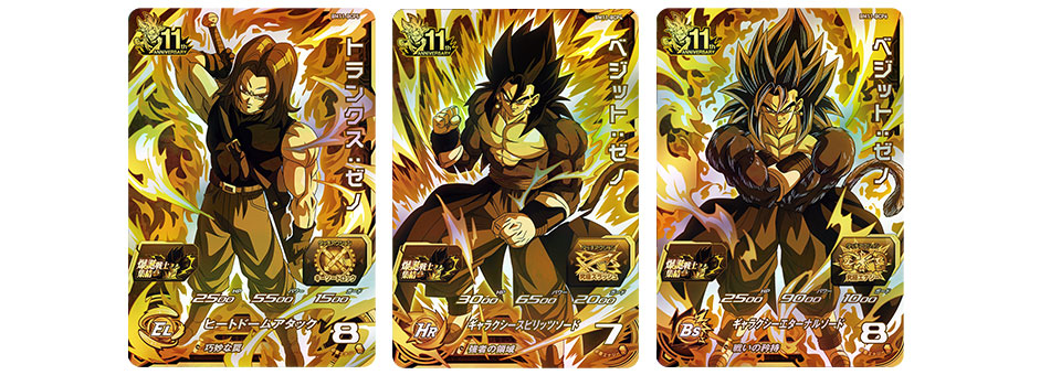 También hay dos explosiones del pasado para el set del 11 ° aniversario: Trunks: Teen y Vegeta del primer set de Dragon Ball Heroes, que se unen a la alineación como tarjetas UR conmemorativas.
