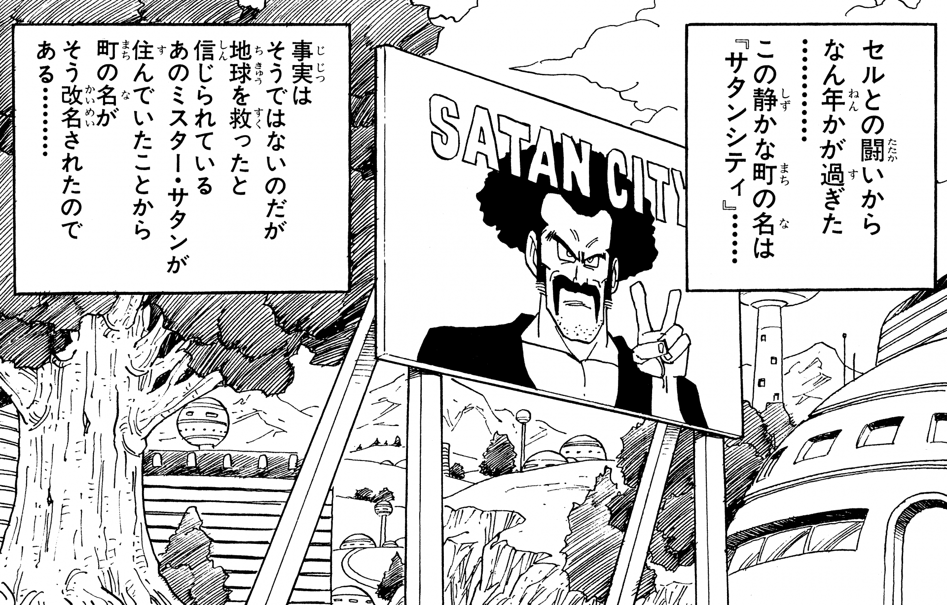 Satan City lleva el nombre de Mr. Satan, el hombre que se cree que salvó al mundo. La escuela de Gohan, Orange Star High School, también se encuentra aquí.