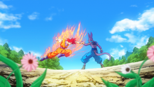 Su siguiente enfrentamiento con Goku en forma de Super Saiyan God se intensifica a una velocidad vertiginosa, culminando con Beerus desatando un ataque lo suficientemente poderoso como para acabar con toda la Tierra. Afortunadamente para nosotros, los terrícolas, Goku revela un poder propio sin precedentes y logra anular el ataque cataclísmico.