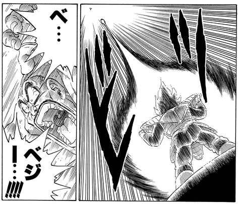 Luchando por respirar, Nappa le suplicó a Vegeta que lo salvara. Sin embargo, el príncipe Saiyajin respondió con frialdad: "¿De qué te sirve si no puedes luchar?" lanzar a Nappa al aire y arruinarlo en el olvido.