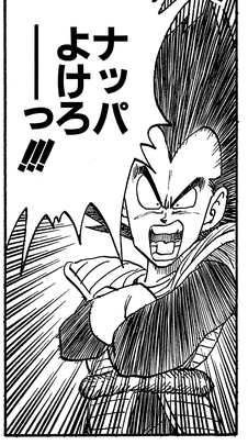 Incapaz de esperar la llegada de Goku para comenzar la pelea, Nappa rugió, "¡¡¡Olvídate de esperar !!!" antes de intentar lanzarse a la batalla porque le apetecía, y cuando se enfrentó al Kienzan con forma de navaja de Kienzan, solo resopló que era solo un "truco de salón" ¡y optó por enfrentarlo de frente!