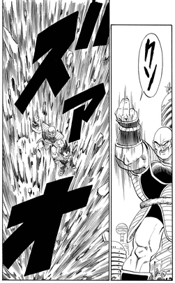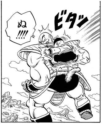 Finalmente, Krillin logró conectar un golpe cuando cortó la mejilla de Nappa con un Kienzan, e incluso Gohan pudo conectar una patada sólida para enviarlo tambaleándose, pero sus intentos parecían solo enfurecer al Saiyajin. En su furia, trató de destruir a Gohan con una monstruosa explosión de energía, pero en un giro inesperado de los acontecimientos, Piccolo se lanzó frente al ataque y se sacrificó para salvarlo.