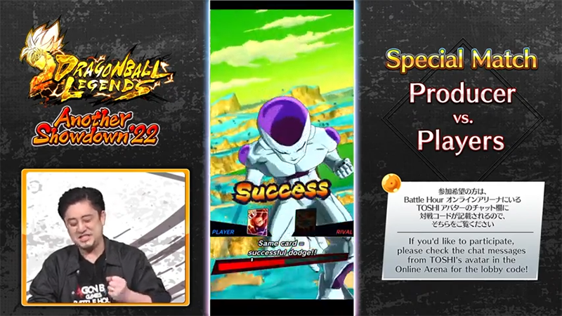 ¡Este año, los espectadores tuvieron la oportunidad de enfrentarse cara a cara en Dragon Ball Legends contra nada menos que el productor del juego, TOSHI! Se dirigió a la arena en línea y transmitió su código de lobby PvP para que todos lo vieran: quien lo ingresara en el juego más rápido sería el que lo enfrentaría. ¿Qué tipo de batallas estaban en la tienda? ¿Y podría TOSHI defender su honor y llevarse a casa la victoria?