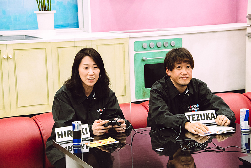 Hirano (izquierda) y el productor Hara (derecha), quienes han trabajado juntos en los mismos títulos en el pasado. Según Hirano, "el productor Hara se dedica a la creación de juegos y disfruta especialmente de los grandes juegos, tanto que incluso llevó una consola al hotel para jugar un poco más antes de llegar al lugar".